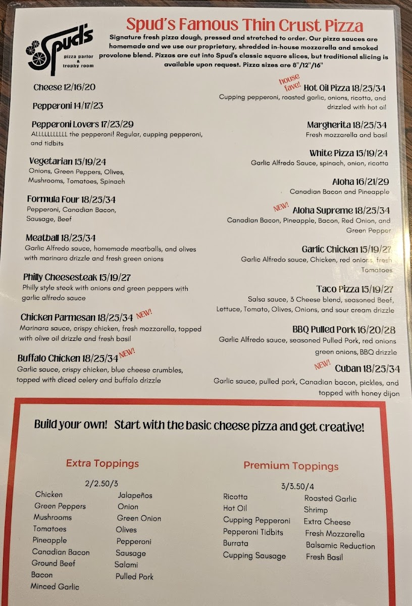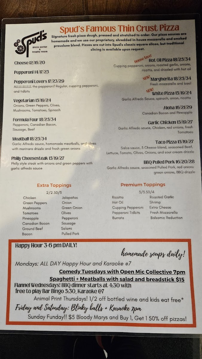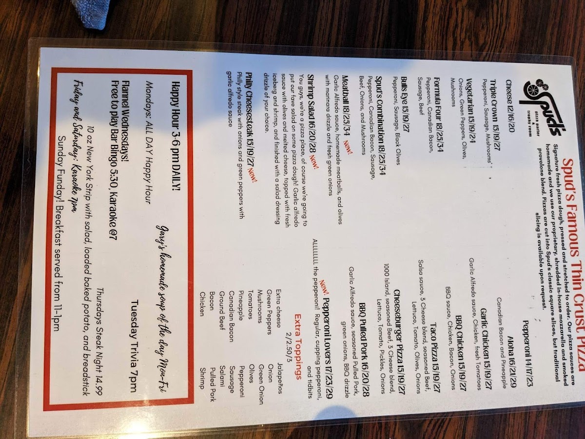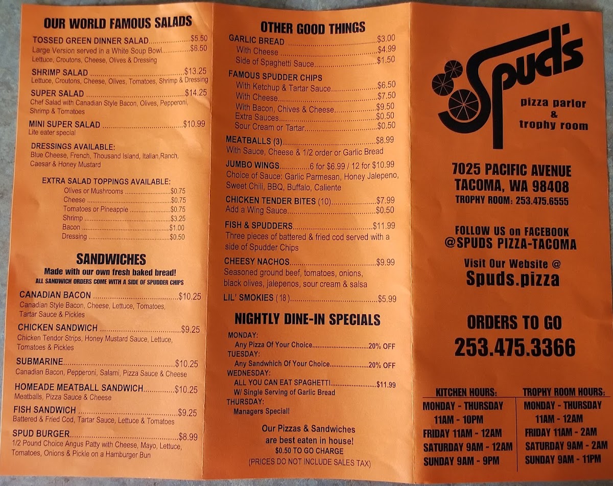 The menu at Spud's Pizza Parlor features a variety of offerings primarily centered around classic pizza options alongside several other categories to accommodate diverse tastes. The food selection is organized into several main groups, including sandwiches, salads with soup, and entrees.
