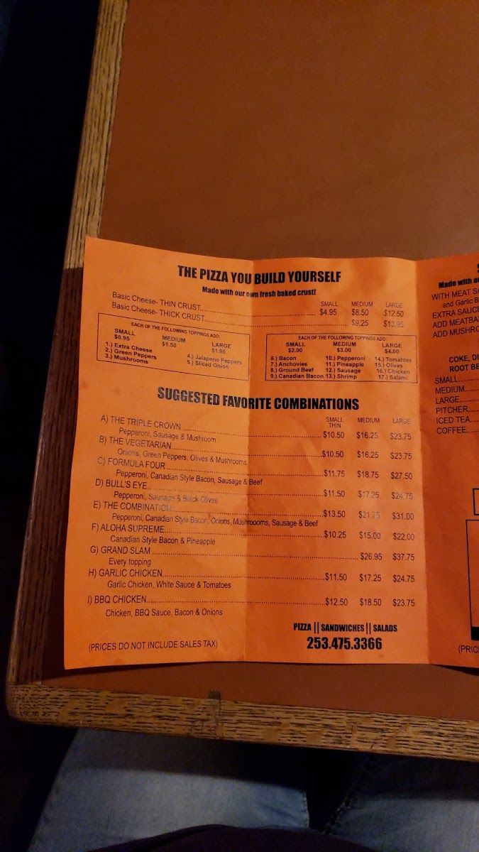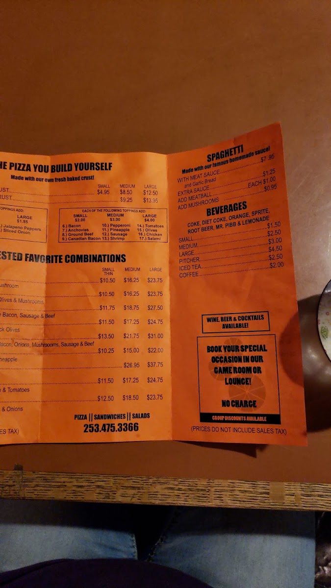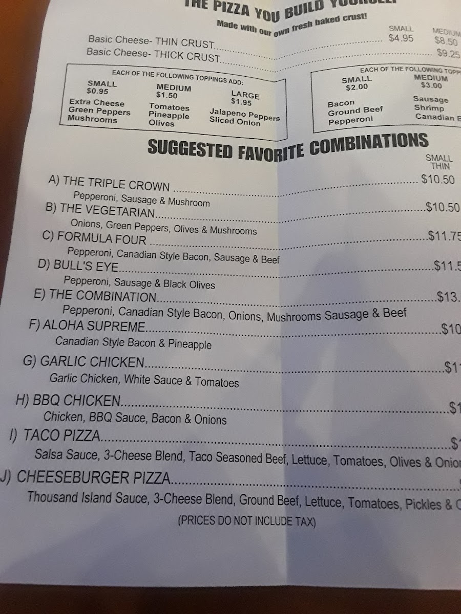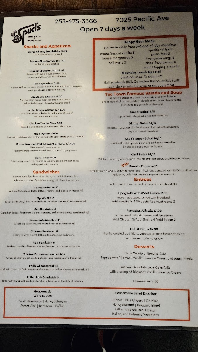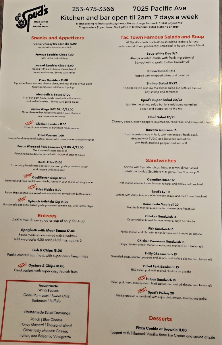 The menu at Spud's Pizza Parlor features a variety of offerings primarily centered around classic pizza options alongside several other categories to accommodate diverse tastes. The food selection is organized into several main groups, including sandwiches, salads with soup, and entrees.